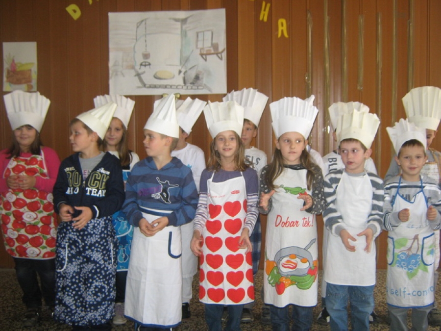 U školskoj dvorani bio je postavljen svečani stol na kojem su bili izloženi plodovi zemlje našeg zavičaja, kruh i krušni proizvodi, koje su vrijedne ruke majki, baka pripremile zajedno sa svojom djecom.