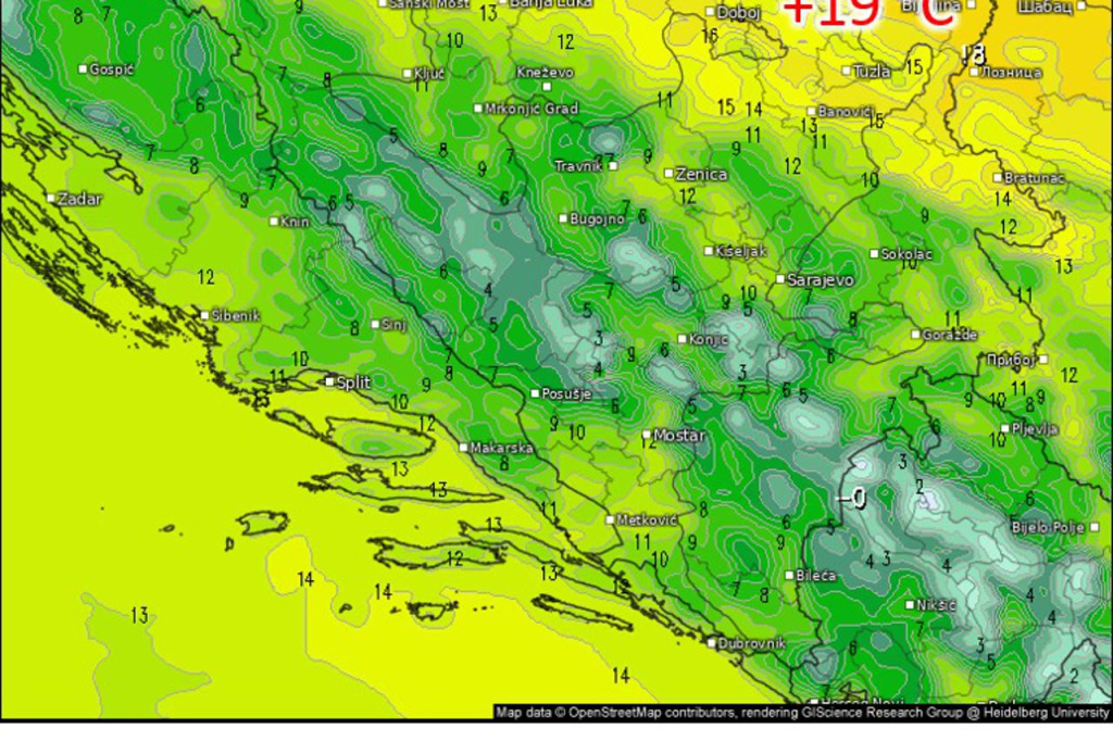Dnevna temperatura zraka će biti od 9 do 15 stupnjeva. Najtoplije na sjeveroistoku Bosne gdje u četvrtak lokalno može biti i 19 °C uz fenski efekt južnog vjetra i sunčanije vrijeme.