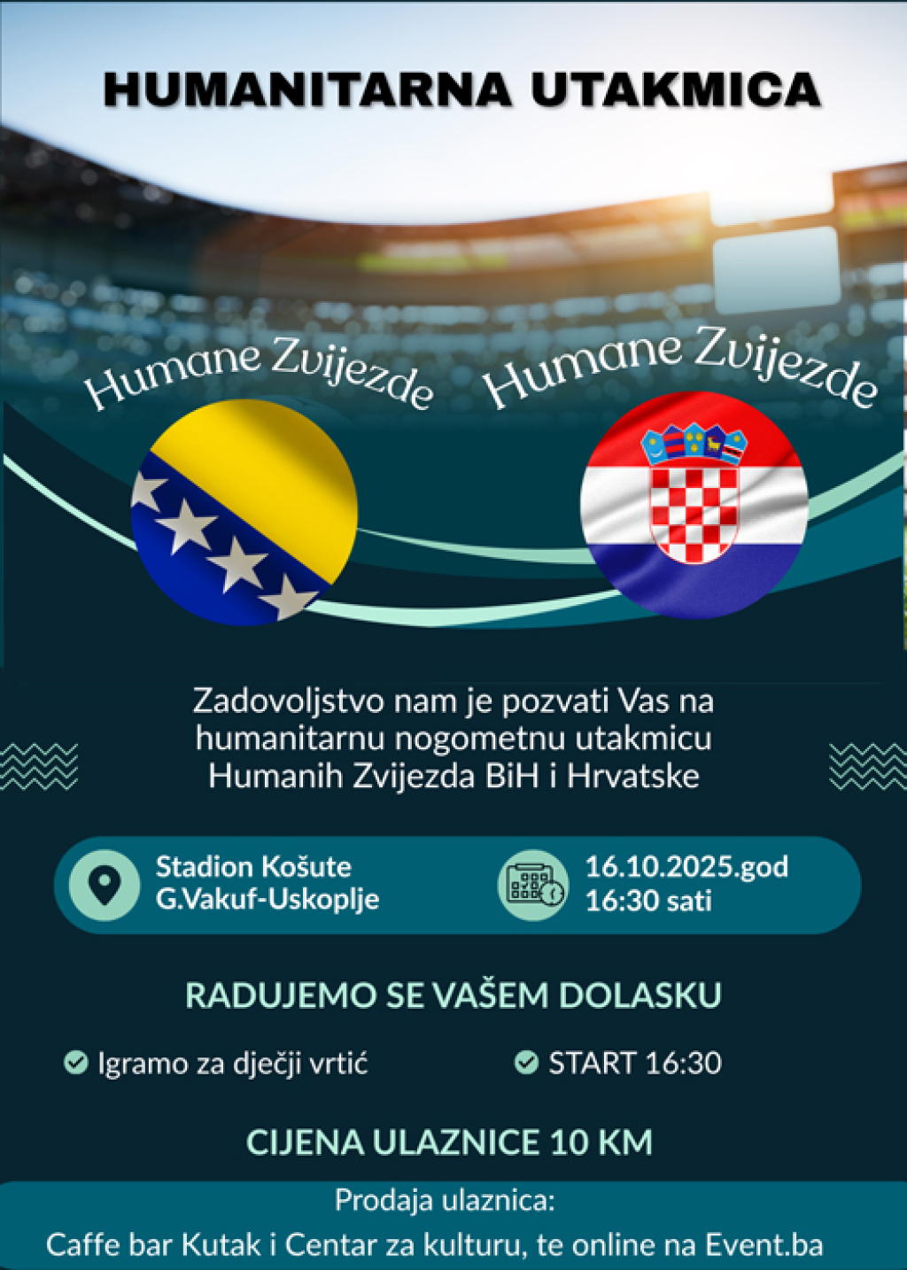 Gornji Vakuf-Uskoplje uskoro će biti domaćin sportskog događaja koji se s nestrpljenjem iščekuje širom regije! Na stadionu Košute će se 16.10. 2025. godine odigrati humanitarna utakmica između Humanih zvijezda Bosne i Hercegovine i Humanih zvijezda Hrvatske, a riječ je o pravom nogometnom spektaklu koji će spojiti sport, humanost i prijateljstvo između dvije države.