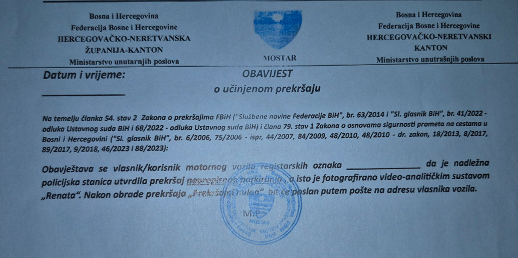 Obzirom da zbog prednjih okolnosti počinitelj prekršaja nerijetko ne bi bio upoznat da je isti počinio do trenutka kada isti primi putem pošte ili osobnim uručenjem, od dana 26. 2. 2026. godine Ministarstvo unutarnjih poslova Hercegovačko-neretvanske županije počinje s pričvršćivanjem obavijesti o učinjenom prekršaju za nepropisno parkiranje kako bi se vlasnik/korisnik vozila upoznao s činjenicom utvrđenja prometnog prekršaja, a iste će postavljati policijski službenici prilikom evidentiranja ove vrste prekršaja, izvijestili su iz MUP-a HNŽ-a.