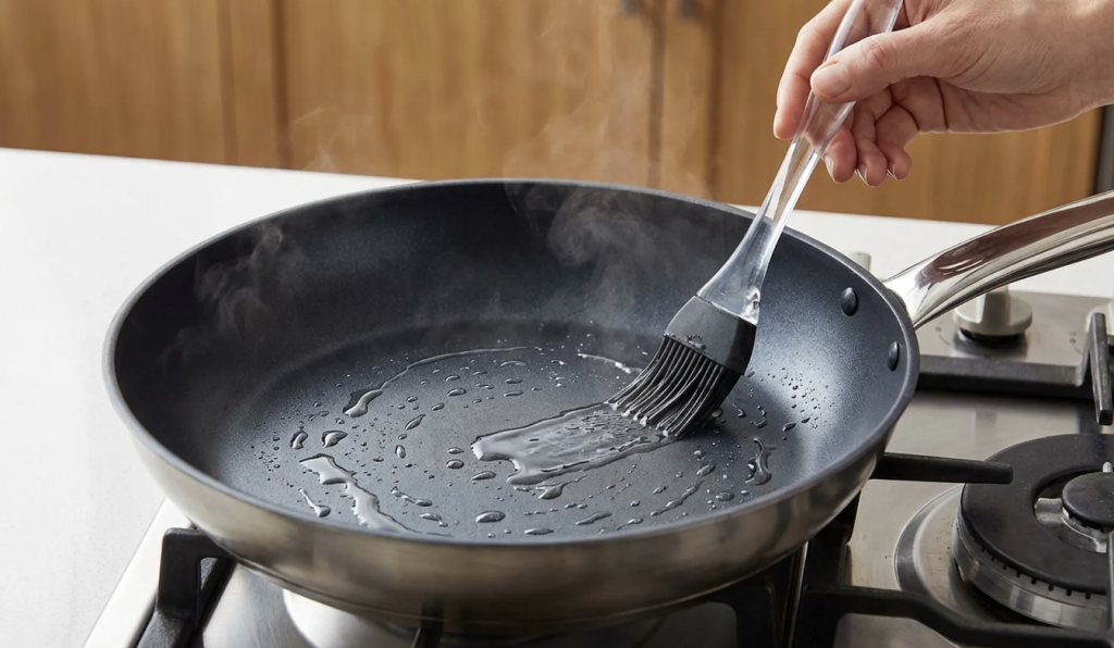4. Tek onda masnoća i hrana. Dodajte ulje ili maslac, pričekajte trenutak da se zagrije pa stavite meso, ribu, tijesto ili palačinke. Pustite da se stvori korica i ne pokušavajte hranu čupati prerano – sama će se lakše odvojiti.