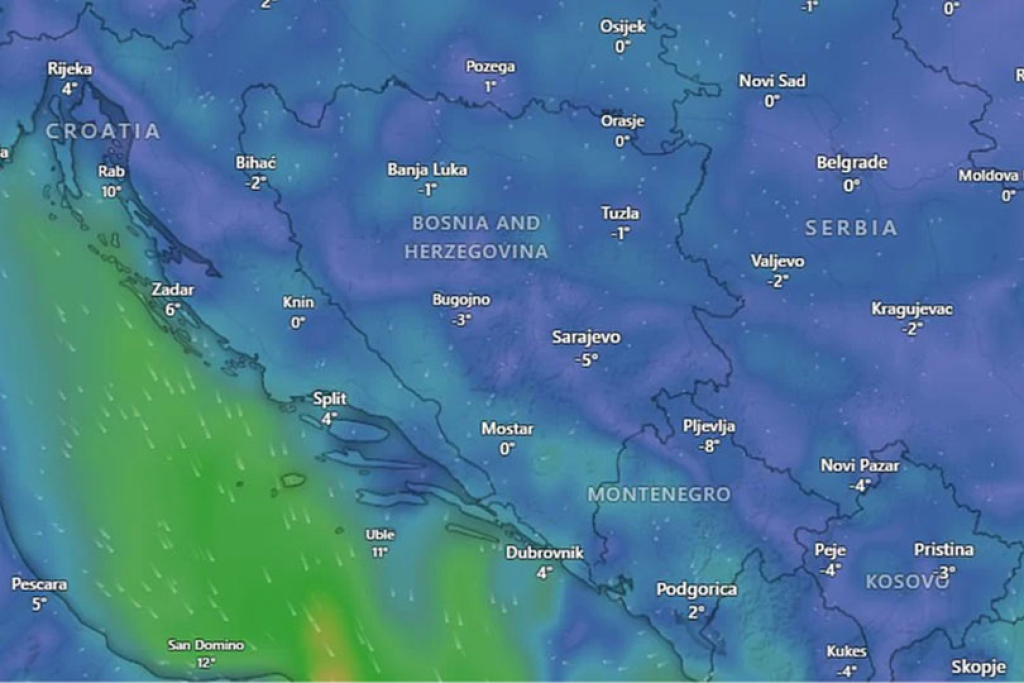 Na jugu i jugozapadu puhat će umjerena bura, dok će u ostalim krajevima biti slab zapadni i sjeverozapadni vjetar. Jutarnja temperatura zraka kretat će se od -10 do -4, na jugu do 2, a dnevna od -4 do 2, dok će na jugu dosezati do 8 stupnjeva.