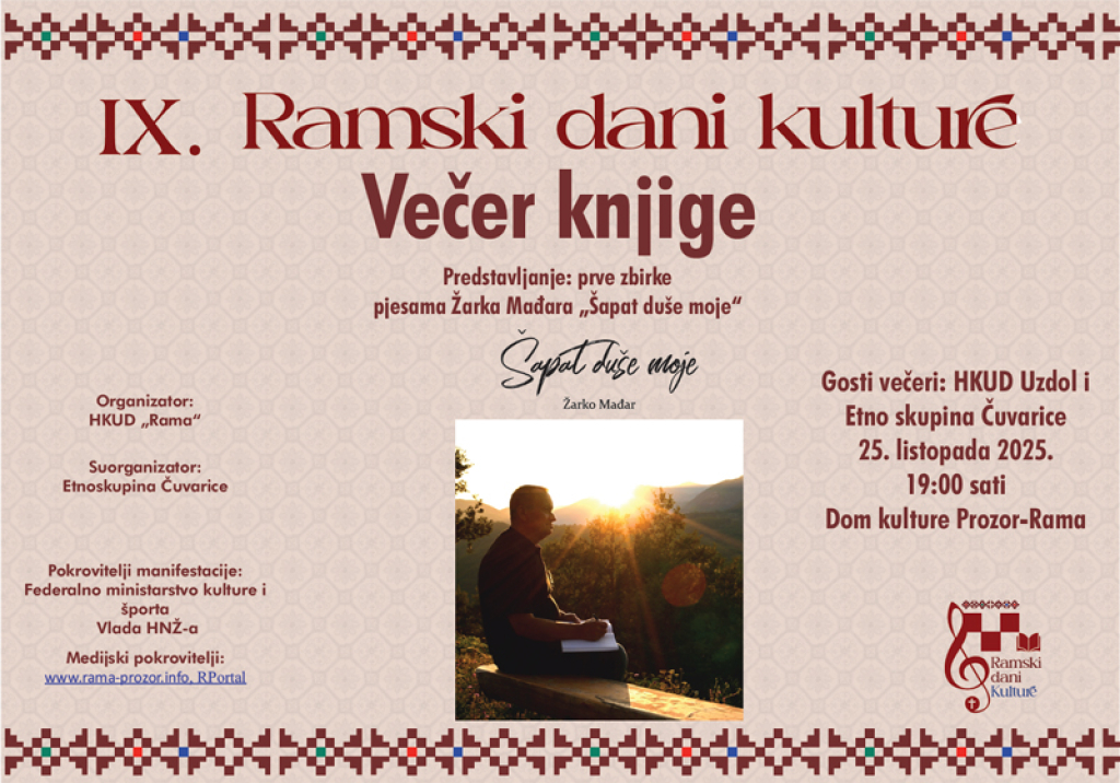 U sklopu IX. Ramskih dana kulture, u subotu 25. listopada 2025., u Domu kulture u Prozoru, održat će se Večer knjige i predstavljanje prve zbirke pjesama Žarka Mađara, naslovljene „Šapat duše moje”.